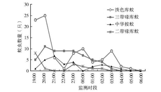 [2] 2020年5月利用气流捕蚊机进行蚊虫通宵观察,19:00至次晨07:00结束,每天1次,取平均值。共监测3次,捕蚊198只,平均密度为 5.50 只/ h。
